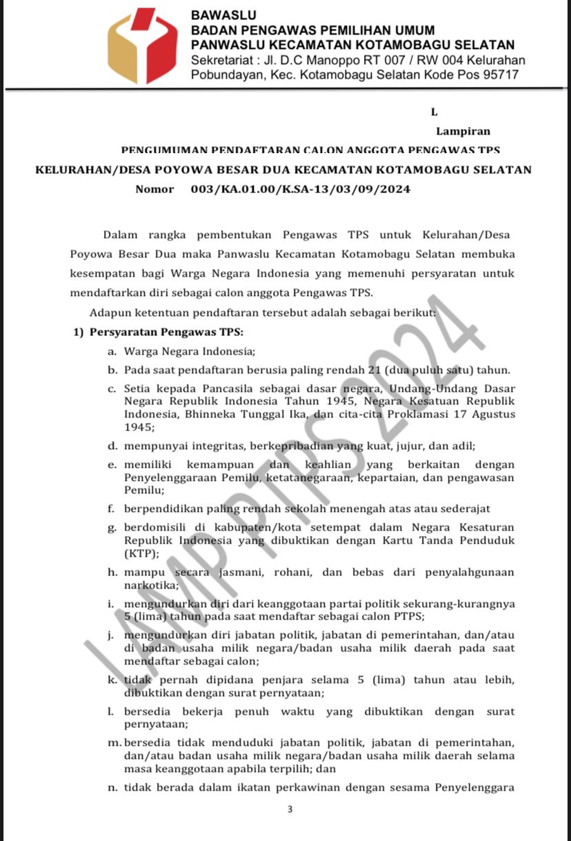 “Kami membuka pendaftaran untuk 25 calon Pengawas TPS yang akan bertugas di 25 TPS se Kecamatan Kotamobagu Selatan pada Pilkada Serentak 27 November nanti,” ujar Stenly, Jumat 13 September 2024.