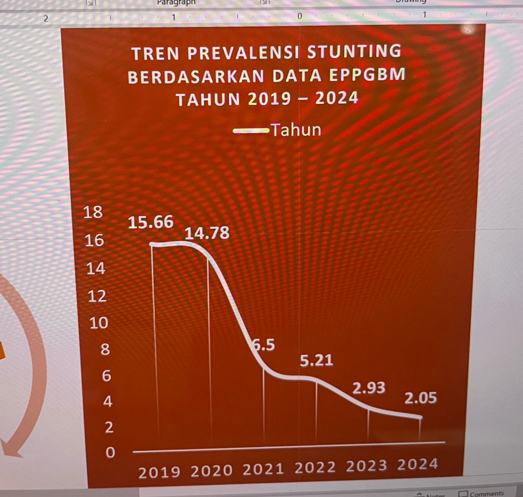 Menurut data Elektronik Pencatatan dan Pelaporan Gizi Berbasis Masyarakat (EPPGBM) Kementerian Kesehatan, sejak 2019 angka stunting di Bolsel turun dari 15,55 persen menjadi hanya 2,05 persen pada Oktober 2024.