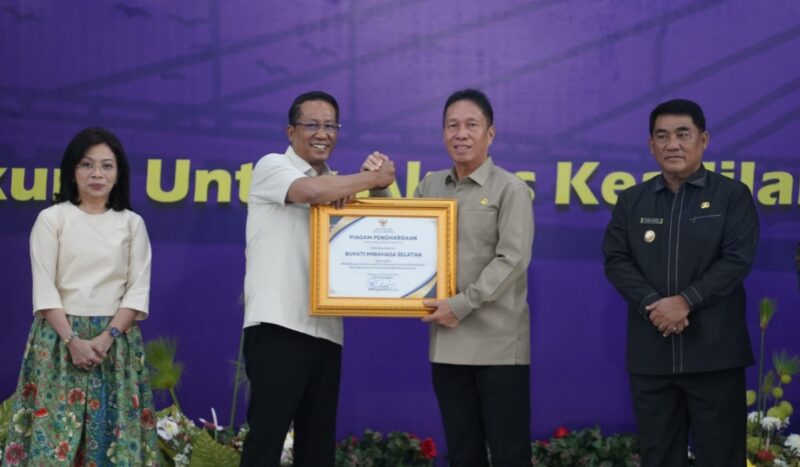 MINSEL- Bupati Franky Donny Wongkar menerima penghargaan dari Supratman Andi Agtas atas komitmennya dalam mendukung pembentukan Pos Bantuan Hukum (Posbakum) di seluruh desa dan kelurahan di Kabupaten Minahasa Selatan.