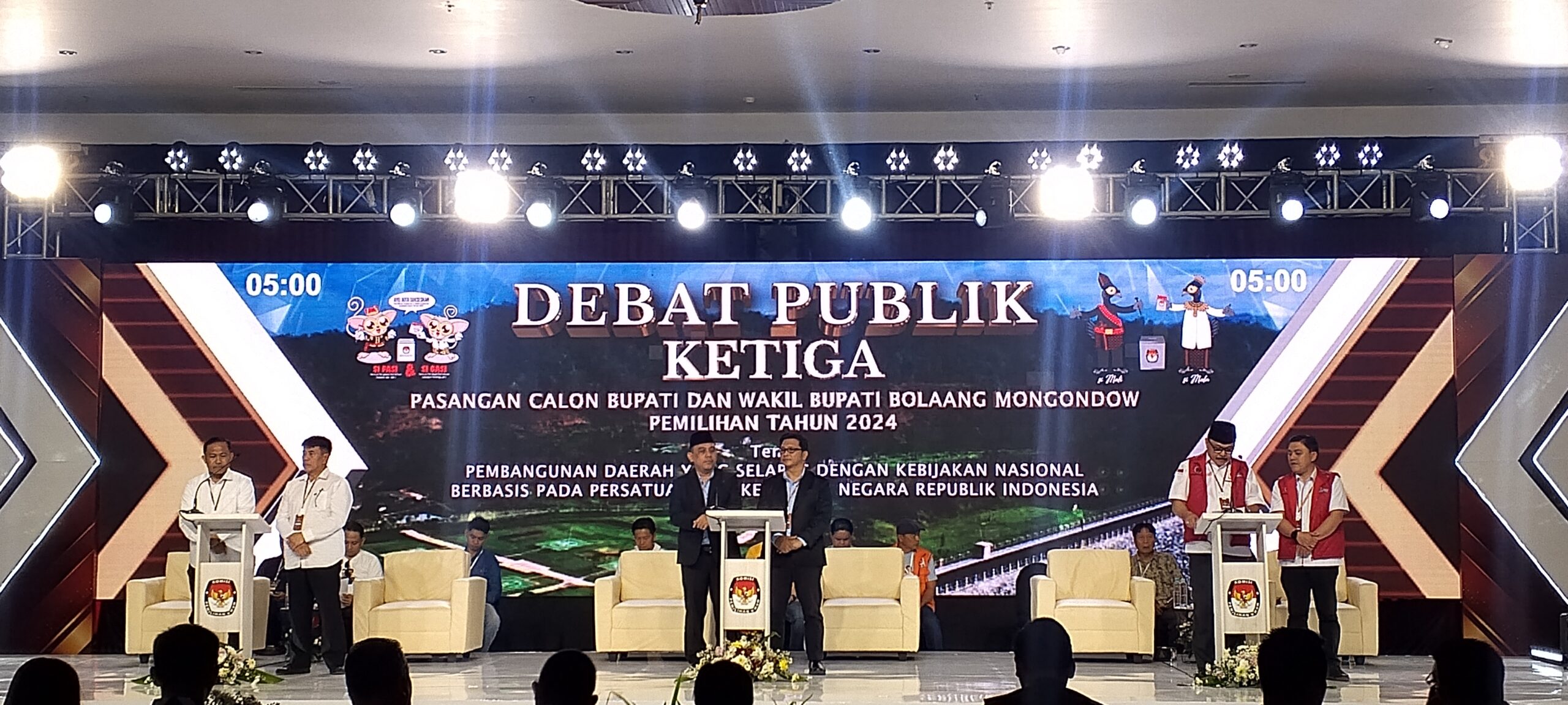 “Sesuai peraturan KPU debat dilaksanakan sebanyak tiga kali, dan Alhamdulillah sampai dengan hari ini, semua tahapan debat telah terlaksana dengan baik. Debat Publik pilkada pertama telah terlaksana pada tanggal 10 Oktober 2024, debat kedua pada Selasa 05 November 2024 dan debat terakhir pada hari ini Senin 18 November 2024 kita KPU Bolmong laksanakan Debat Publik Ketiga bertempat di Hotel Sutan Raja Kotamobagu, yang kami siarkan secara langsung di canel TVRI dan YouTube, juga Link resmi KPU. Jadi Debat kali ini semua masyarakat dapat melihat mendengar visi misi Paslon bisa sampe ke publik, dan kami telah lakukan sesuai prosedur peraturan KPU,” ungkapnya.