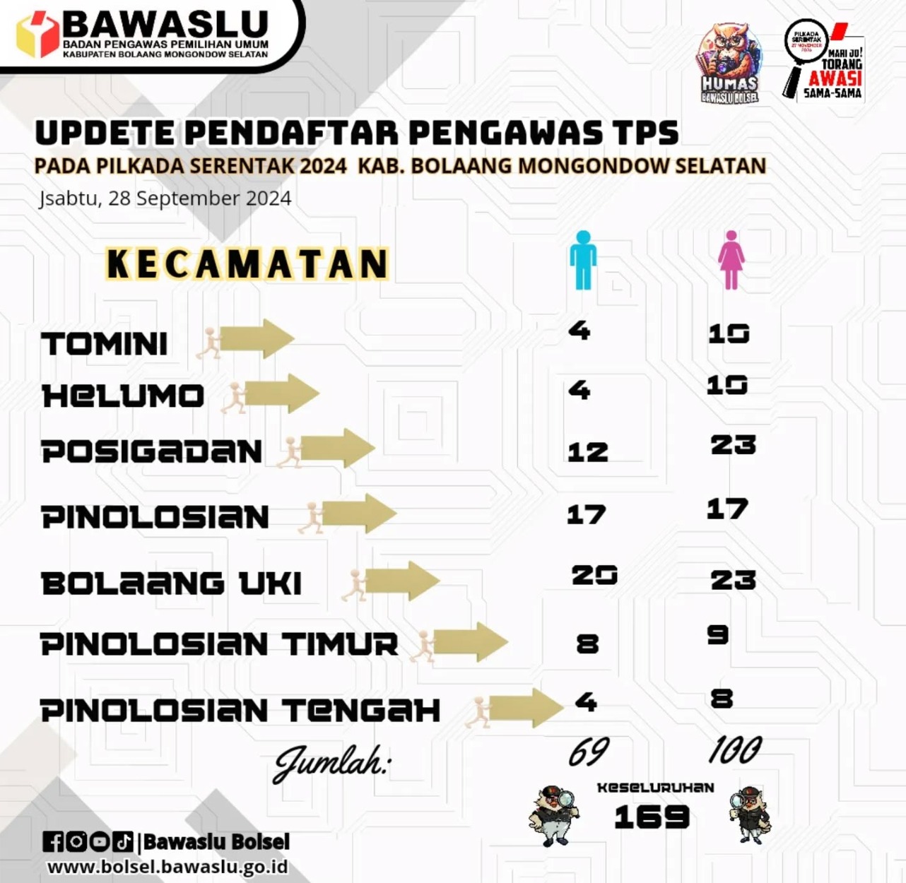 “Dari tujuh kecamatan di Kabupaten Bolsel, hingga saat ini ada 169 pendaftar TPS untuk Pilkada 2024,” ungkapnya.
