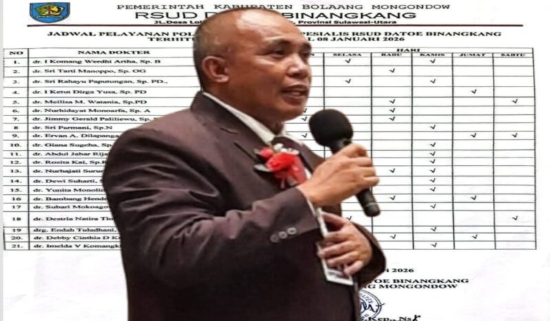 BOLMONG – Rumah Sakit Umum Daerah (RSUD) Datoe Binangkang, Kabupaten Bolaang Mongondow, resmi mengumumkan pembaruan jadwal pelayanan poliklinik dokter spesialis yang mulai diberlakukan pada Kamis, 8 Januari 2026.